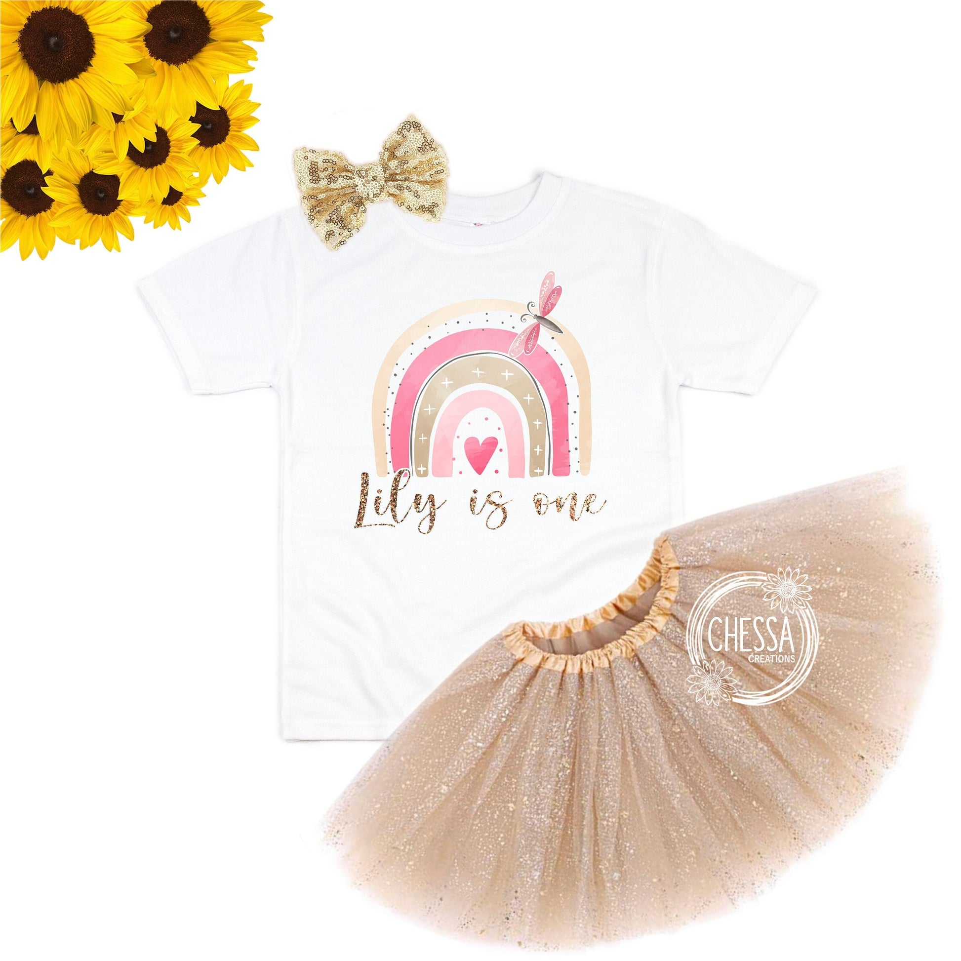 1st Birthday Girl Outfit, Rainbow, Name Shirt for First Birthday Girls Cake Smash, Birthday Long Sleeve, Pink Gold, Tea Party, DTG Ink Print