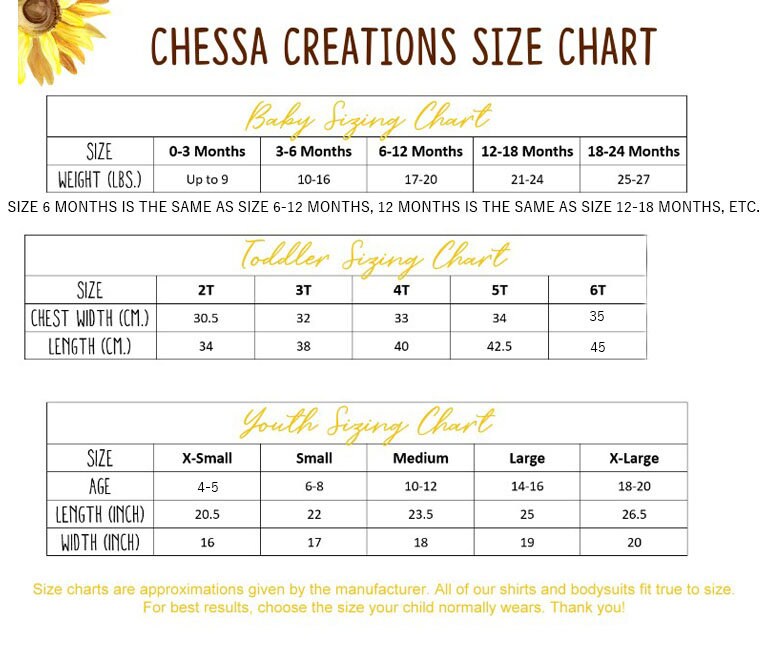 ♥TRUE TO FIT SIZES. Stop worrying about sizes! Chessa Creations’ sizes are proudly the most true-to-size fit on Etsy! Just choose the size your child normally wears and its sure to fit like a glove. We have bodysuits and tshirts in Newborn through Youth XL sizes. Even long sleeve available!