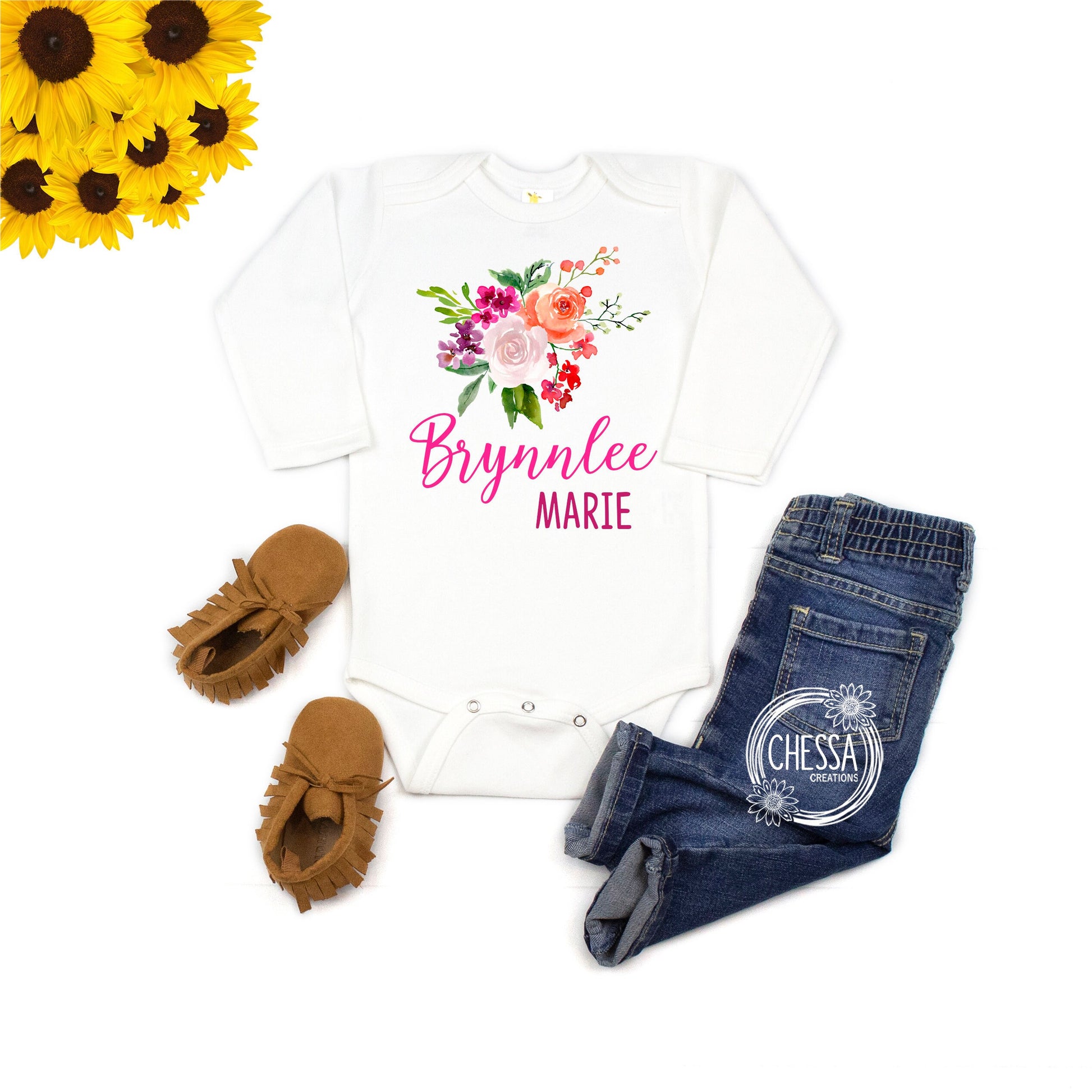 Baby Girl Coming Home Outfit, Custom Toddler Girls Clothes, Long or Short Sleeve Shirt with Tutu and Bow, Floral Coral Purple Name, DTG Ink