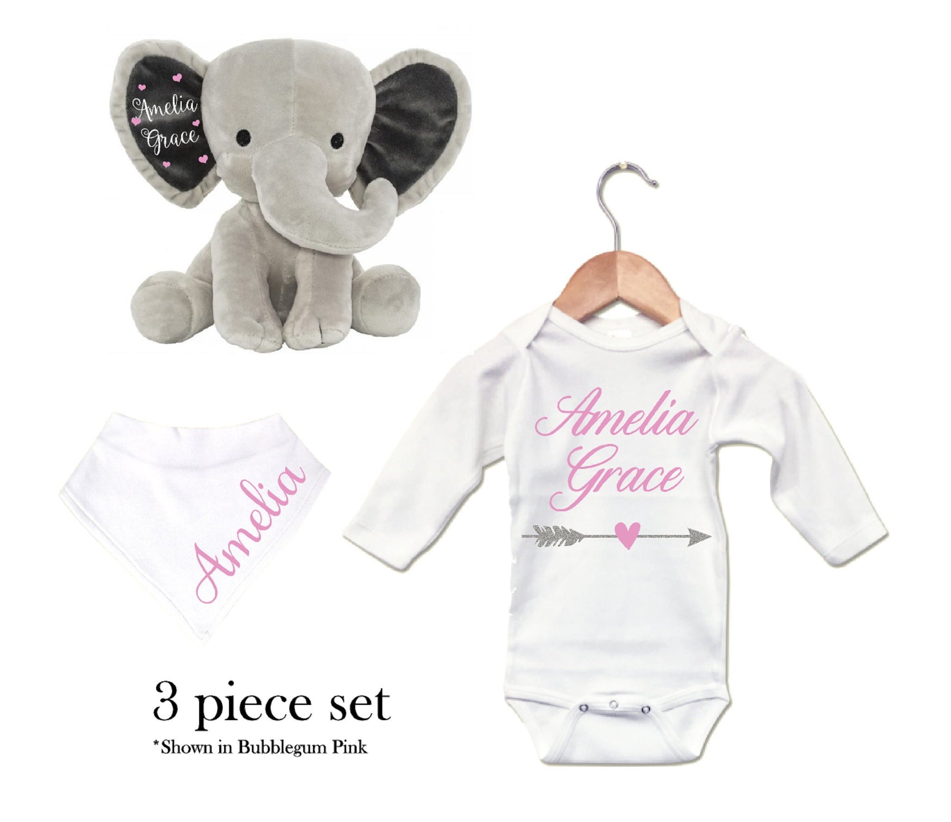 Adorable custom 9” plush elephant AND add a custom Bodysuit and bib to make it a complete gift set for baby and the new Mama!