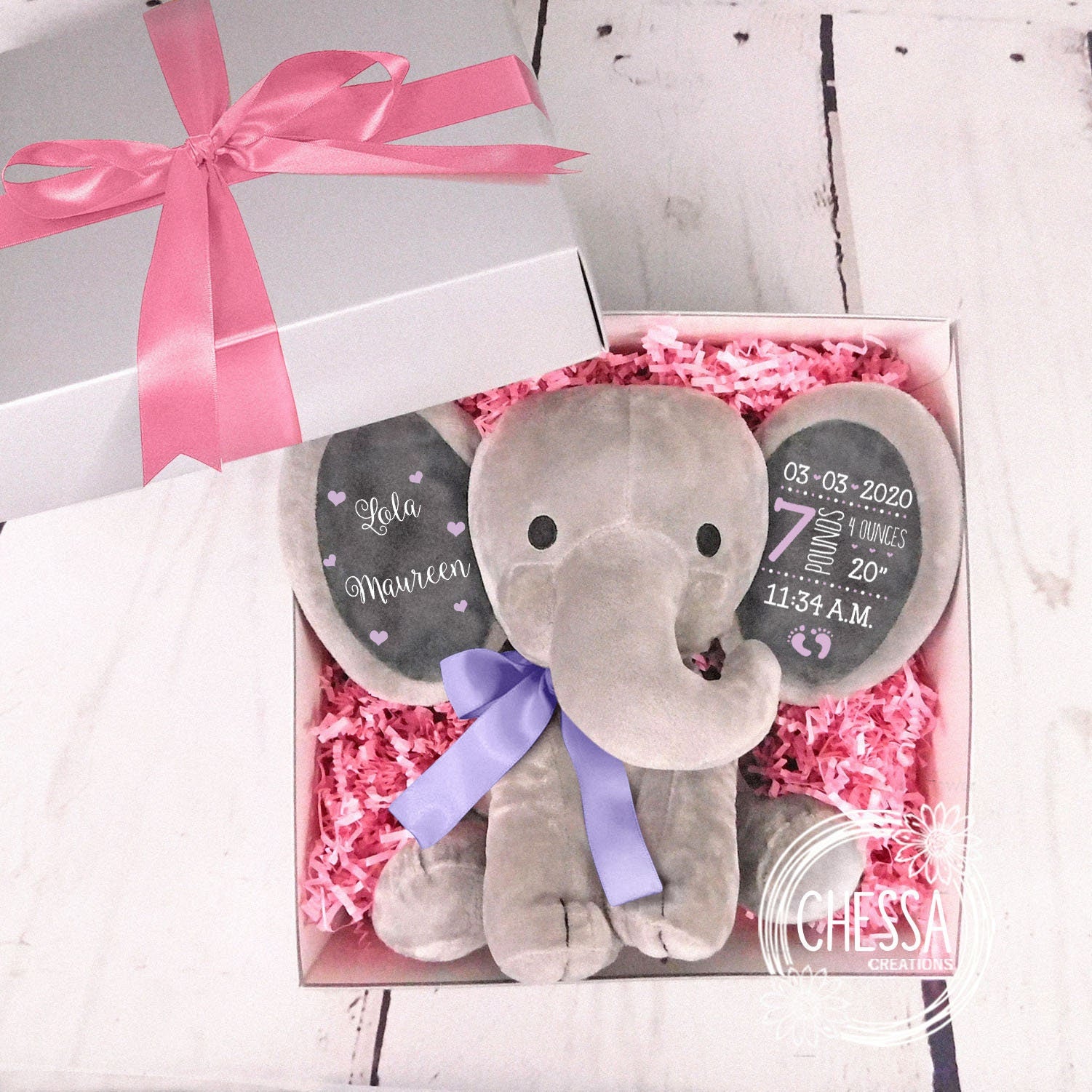 I can add ANY INFO to the other elephant ear such as "Love, Auntie Jane", or if baby has been born, I can include birth date and any other info you would like included. Just note your customization for the other ear in the notes :)